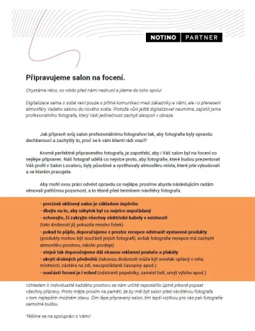 Každý salon navíc obdržel dokument "Jak se připravit na fotografování", který vysvětloval, jak by měl salon před focením vypadat. Tento dokument zaručil plynulý průběh fotografování bez zbytečných prodlev.